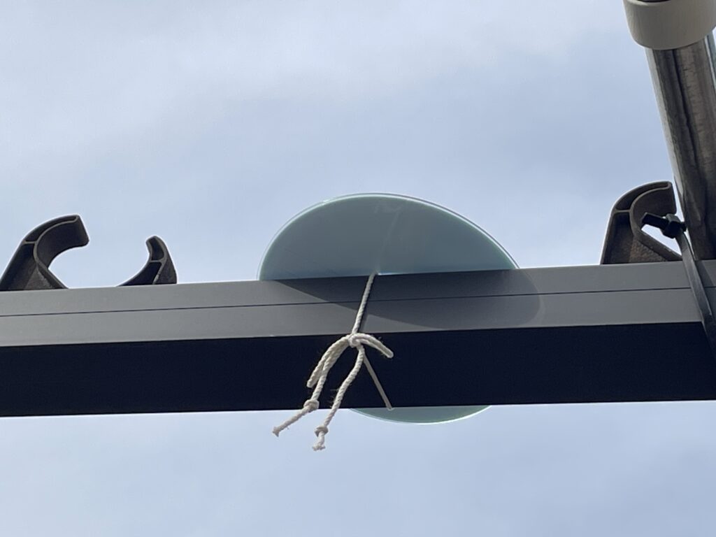 CDを紐で吊るすのをやめて、物干し台に、直接、紐で縛ることにしました。