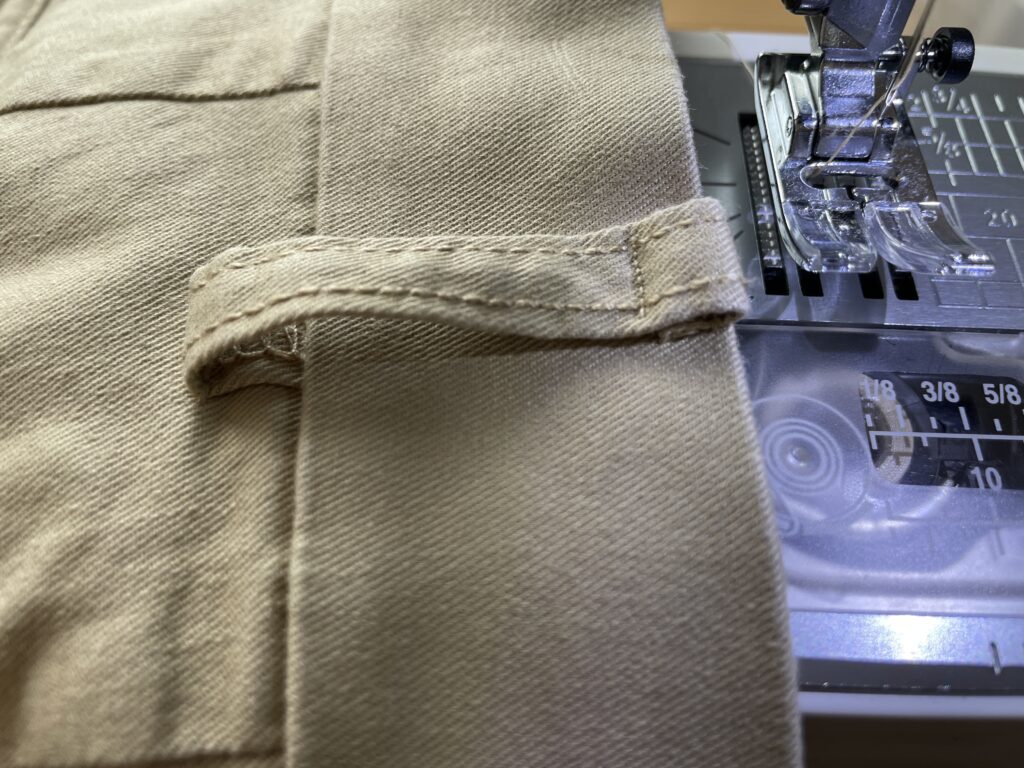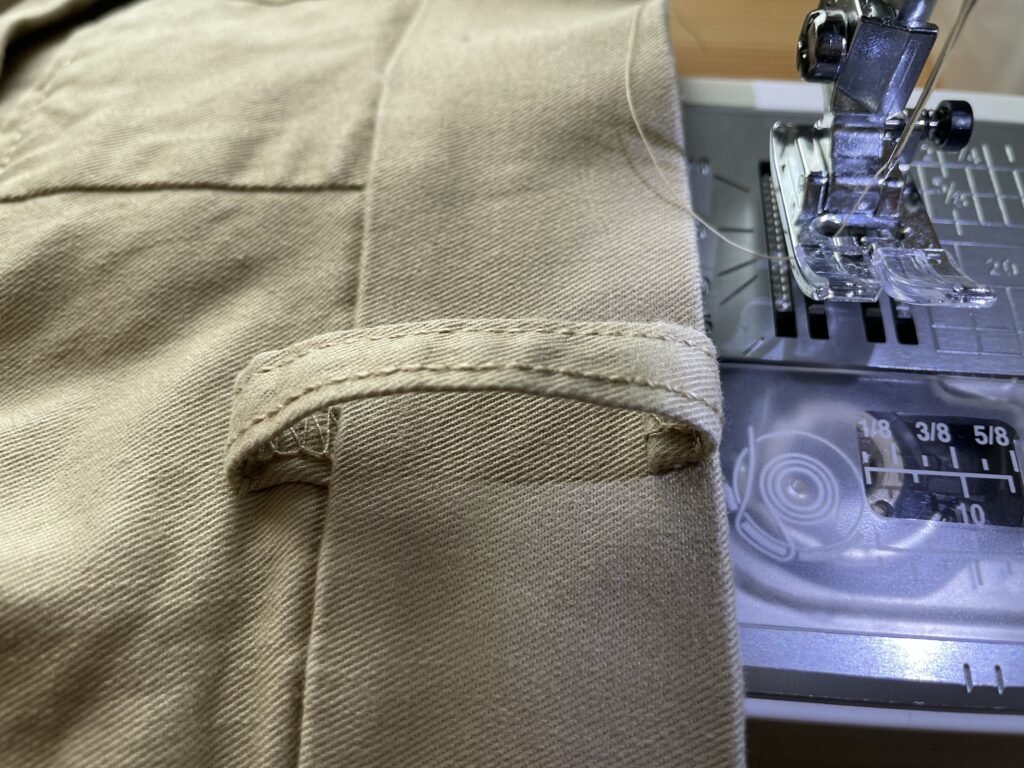 方法は、ベルトループの上端をチノパン上端に合わせて、縫い付けます。
