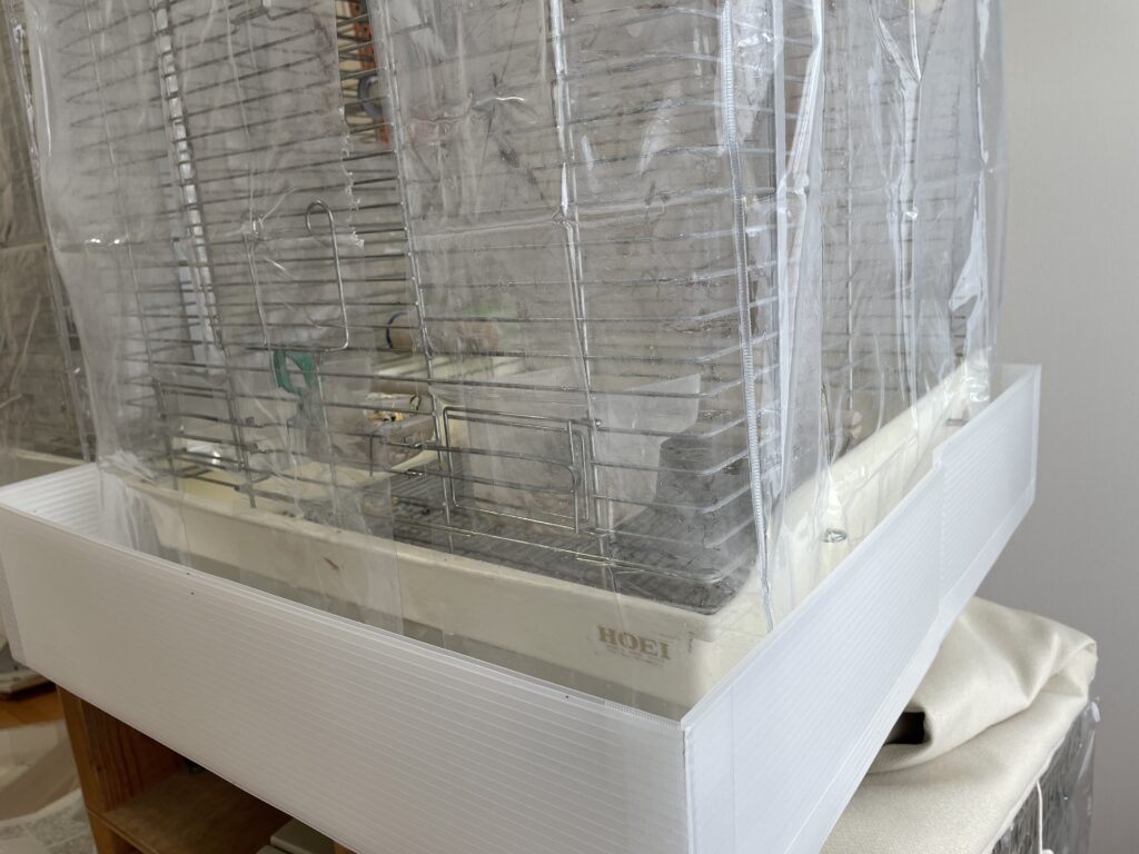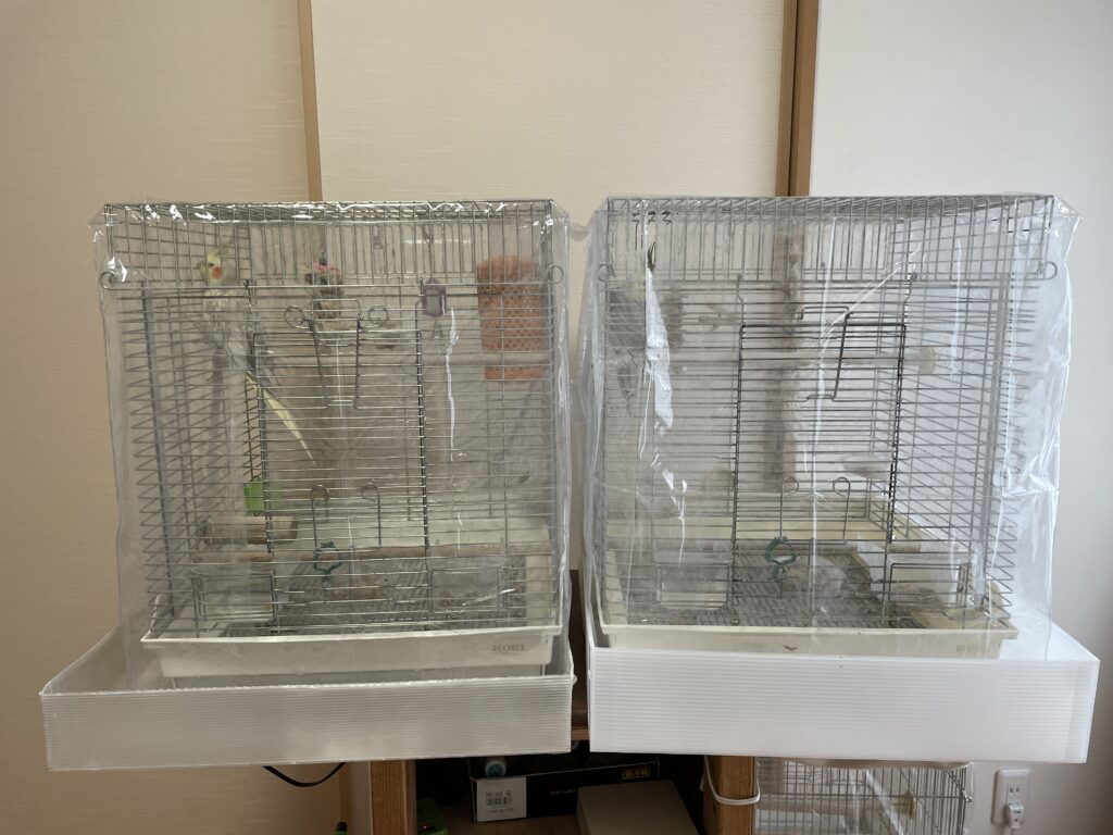 小鳥のカゴにエサ飛散防止の囲いを付けると、掃除の時間を短くすることができます。